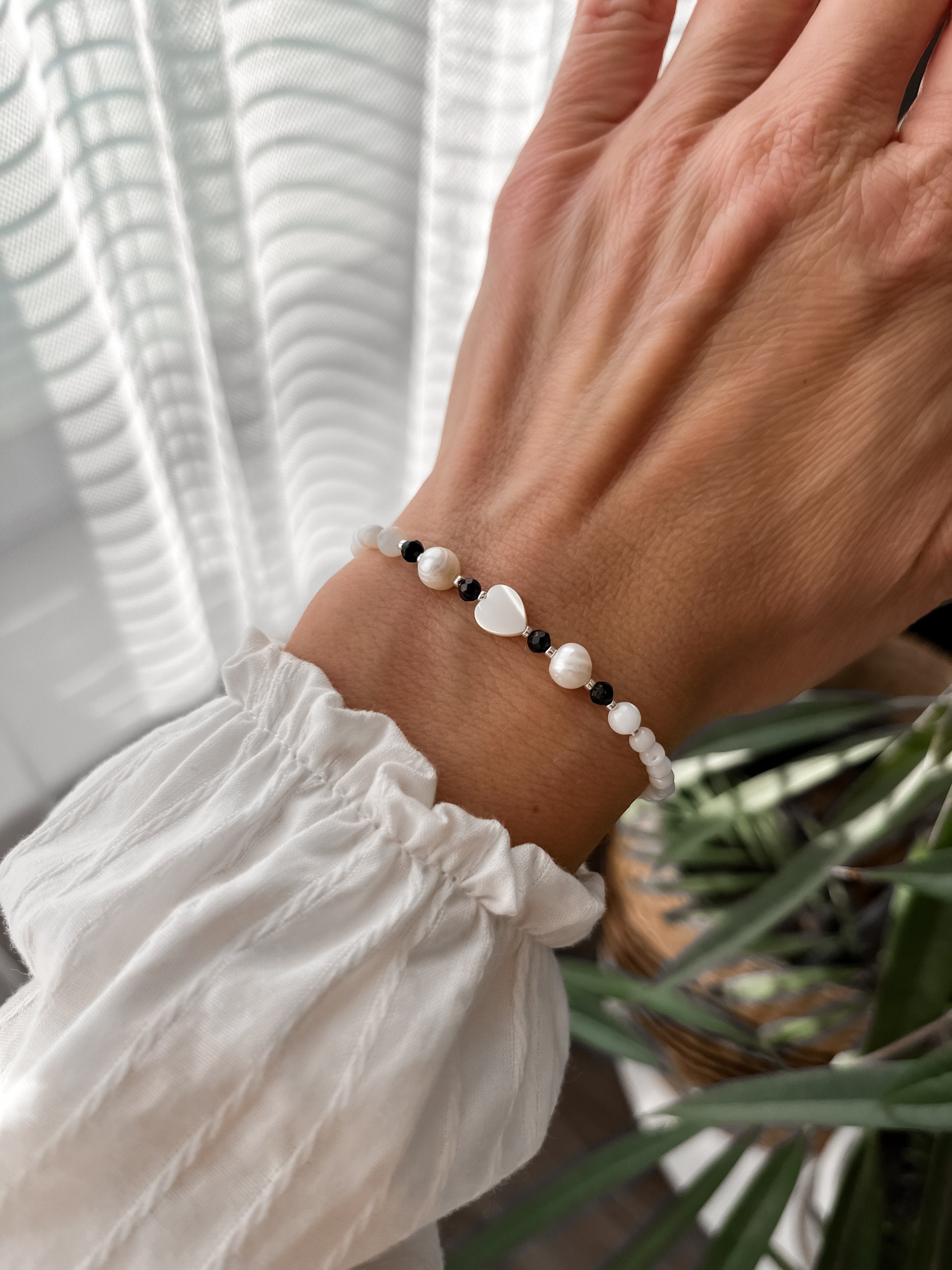 Jemný a elegantný náramok z perlete, ónyxu a riečnych perál je symbolom ochrany, vnútornej rovnováhy a ženskej jemnosti.