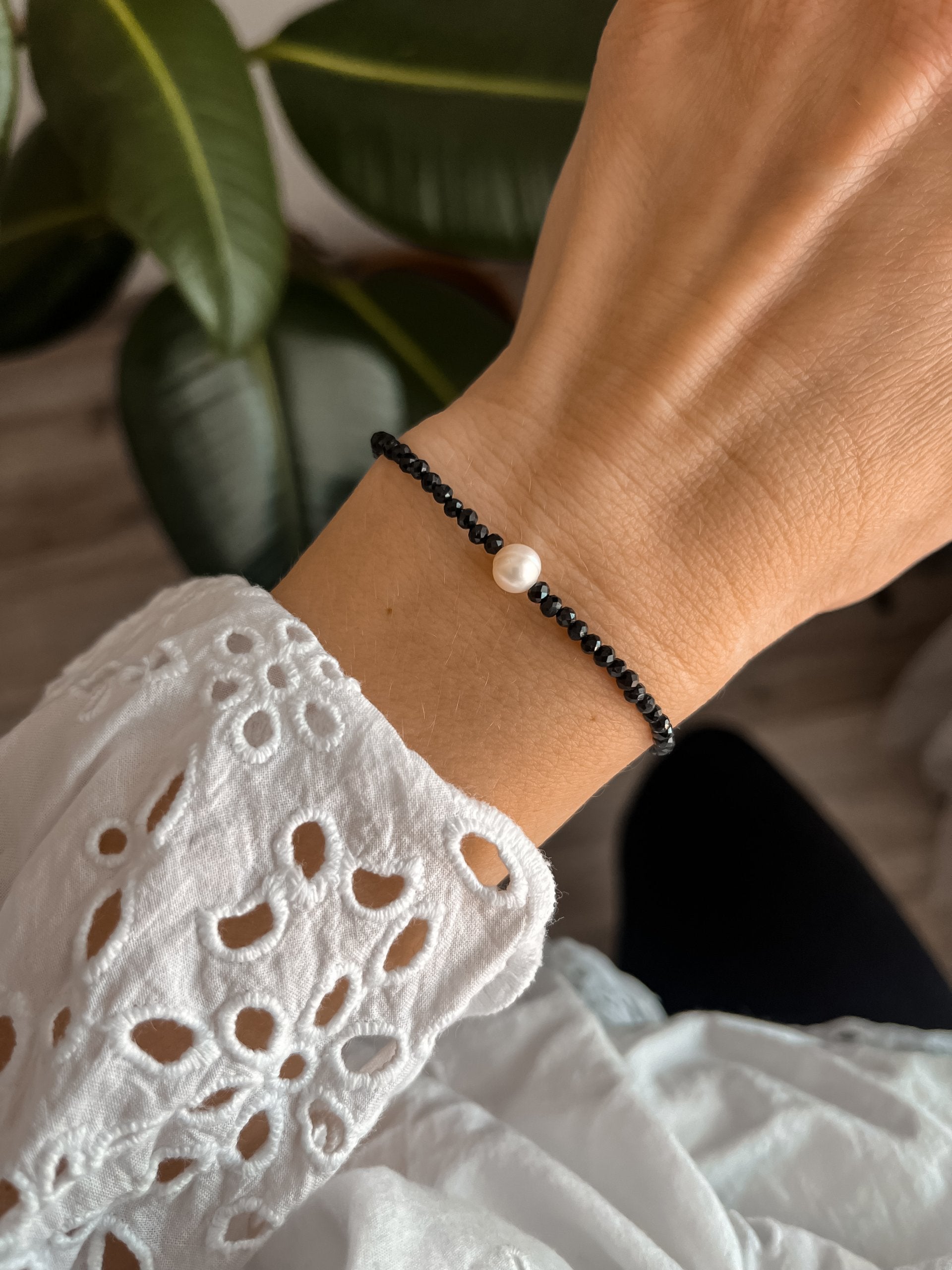 Elegantný náramok z riečnej perly a ónyxu je jemným spojením ženskej jemnosti a vnútornej sily.